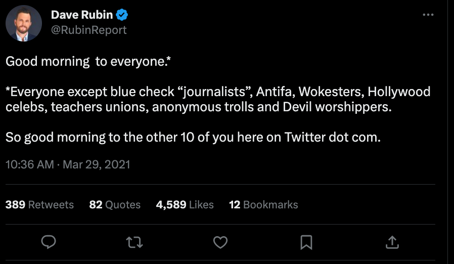 Dave Rubin — political commentator, a self-described member of the intellectual dark web that was erroneously characterized as intellectual (verified through Twitter Blue and previously through Twitter's legacy verification program)