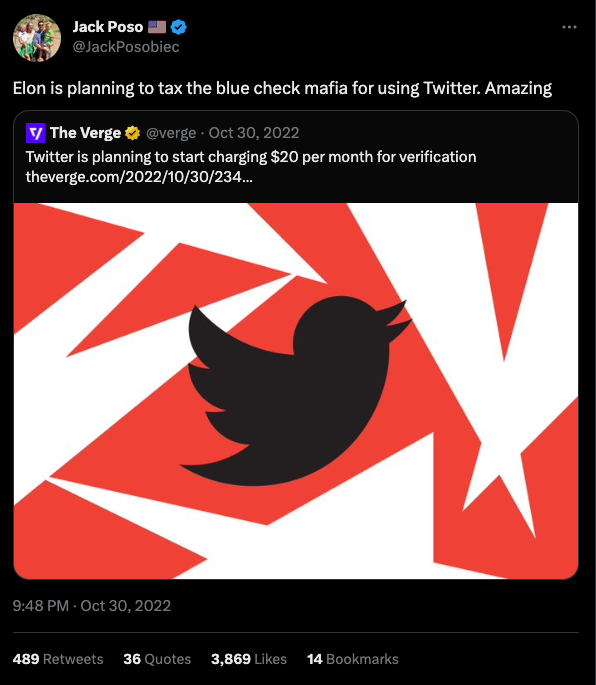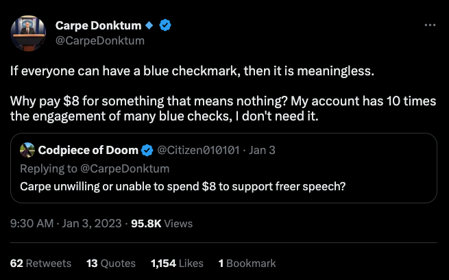It also meant to a bizarrely large swath of the right, even those that were verified, that you were simultaneously part of some hated elite and a weakling. At least until it ceased being free.