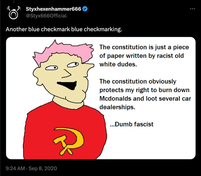 Suddenly, being verified doesn't make you a snowflake. It means owning the libs. But of course, a lot of new-fangled paid blue check havers forgot to delete their insults about the status marker. Because why would you? Consistency is for cucks.