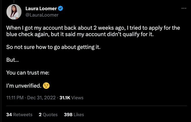 Laura Loomer — allegedly the most banned woman in the world (n.b., there is no supporting evidence necessary for such a claim), once chained herself to Twitter HQ (verified under Twitter Blue and previously under Twitter's legacy verification policy until she began her journey to become the Most Banned Woman In The World)