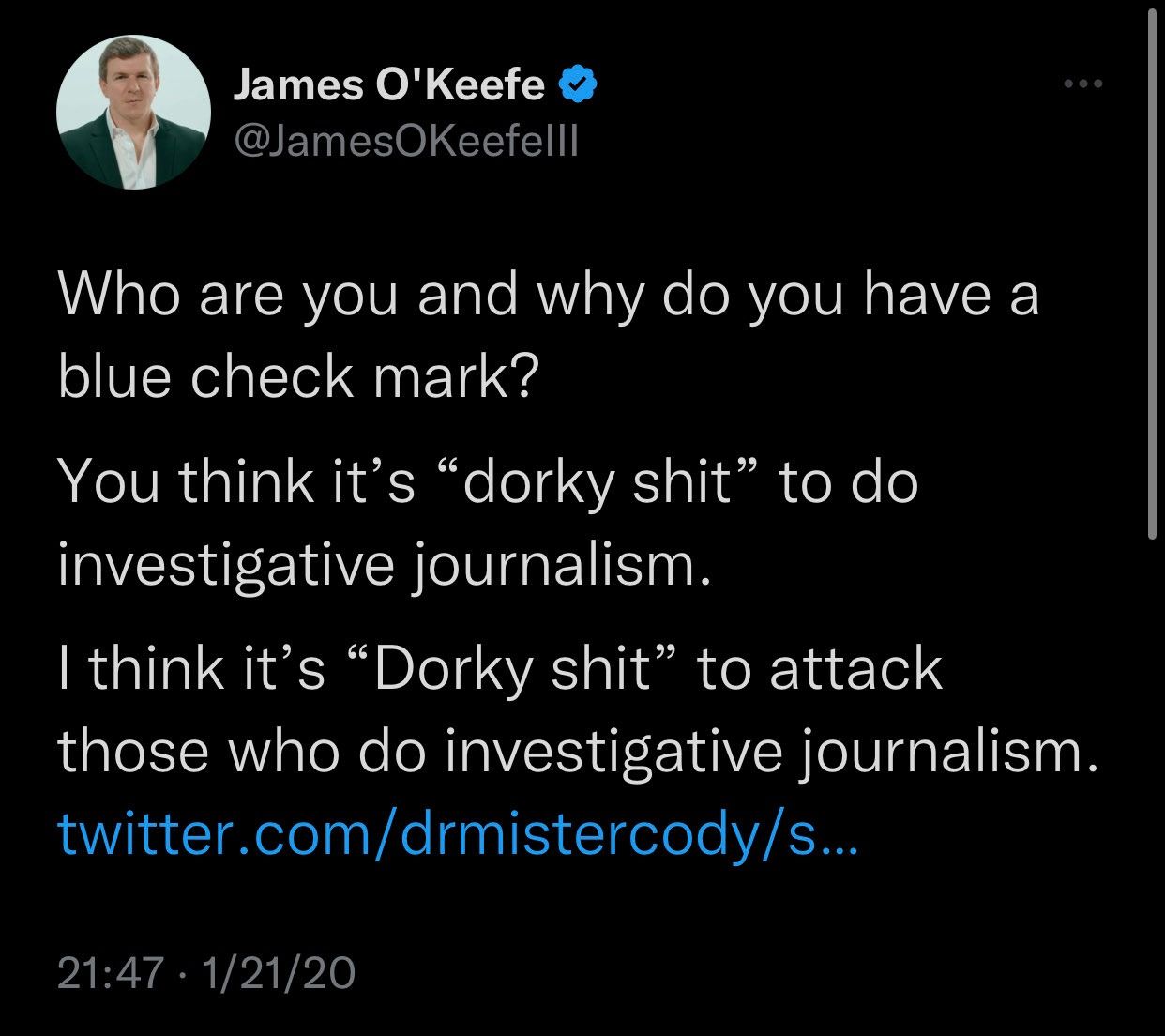 James O'Keefe — the now-former head of the hard-right propaganda group Project Veritas and a music video star of questionable talent (verified through Twitter Blue)