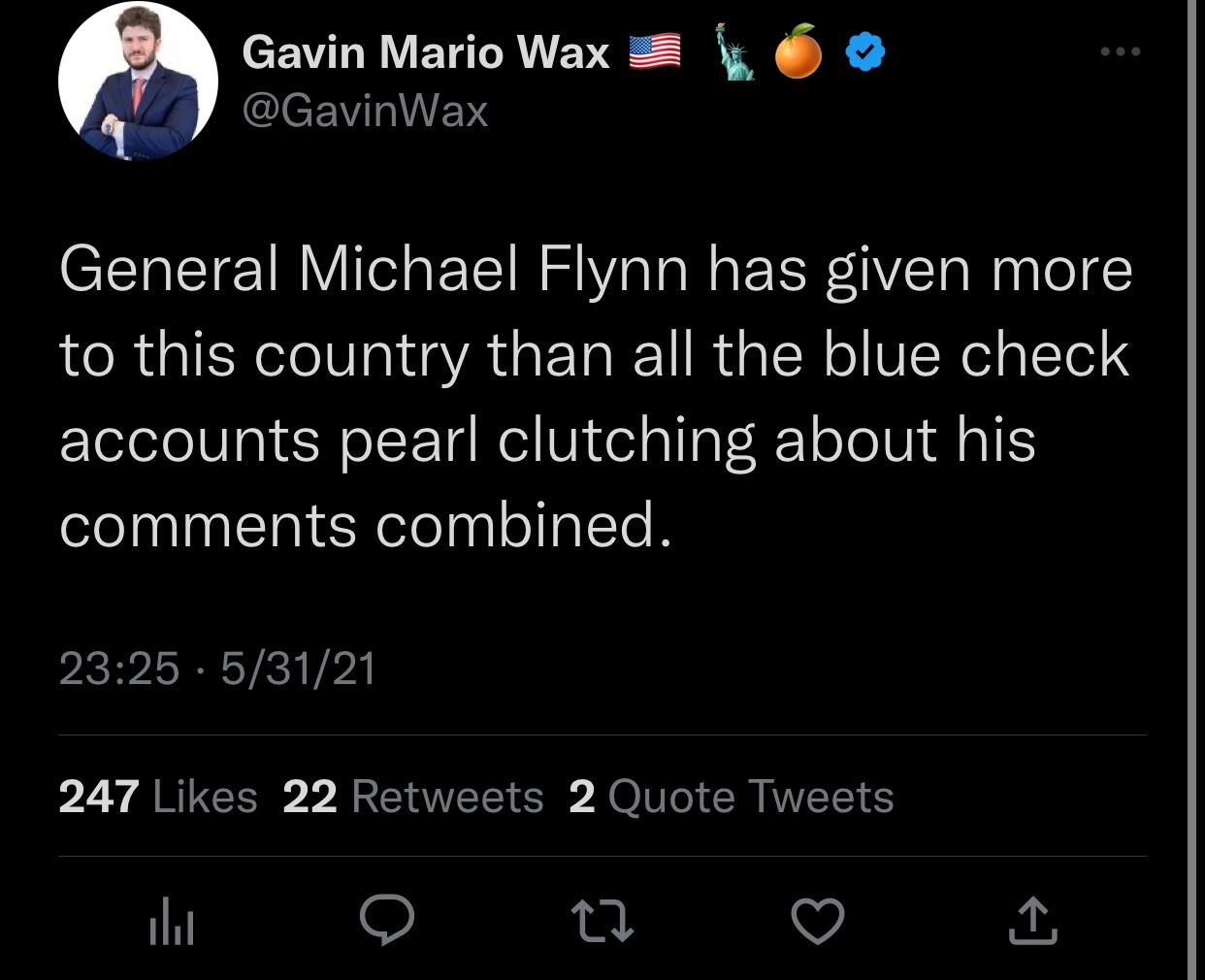 Gavin Mario Wax — head of the New York Young Republican Club, encourages people to drink martinis of middling quality (verified through Twitter Blue)